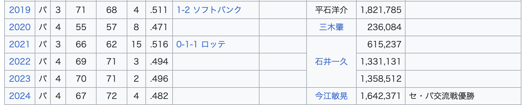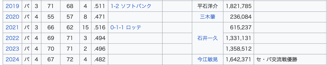 てか今年も4位なんだよなあ。毎年CS進出争いしてないか?と思って改めて確認してみたら、なんと2019年から2025年まで3位か4位しか取ってない。